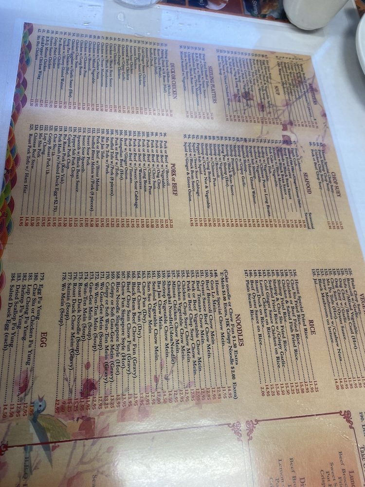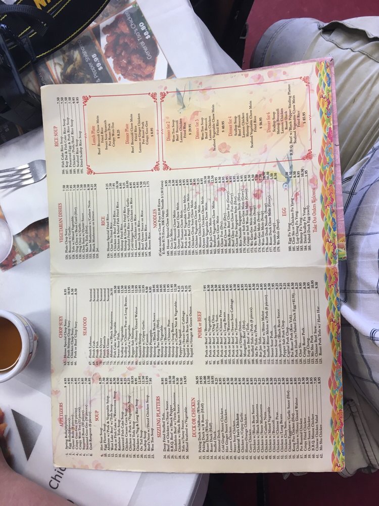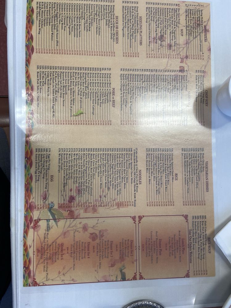 Includes beef broccoli chow mein, fried rice, sweet sour spareribs, pot roast park, and crispy won ton.