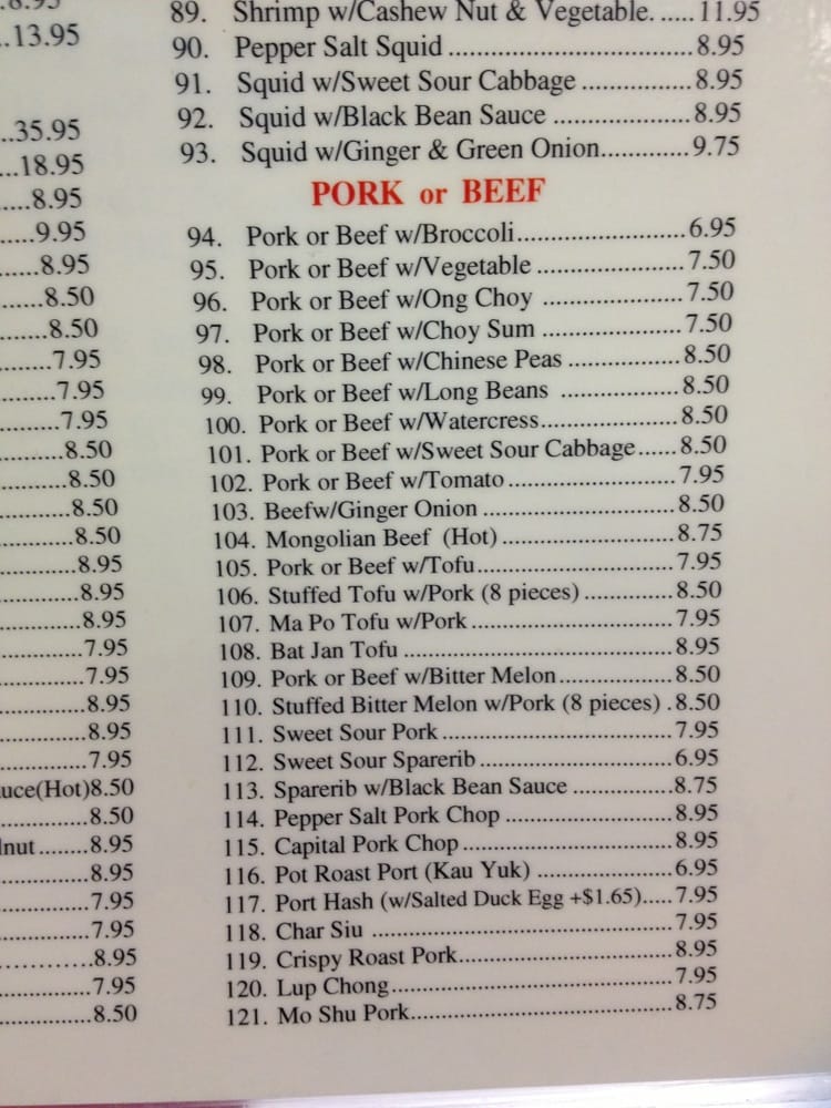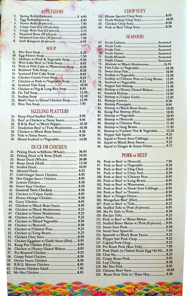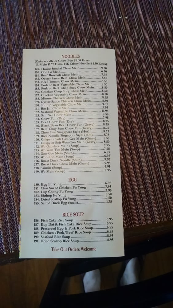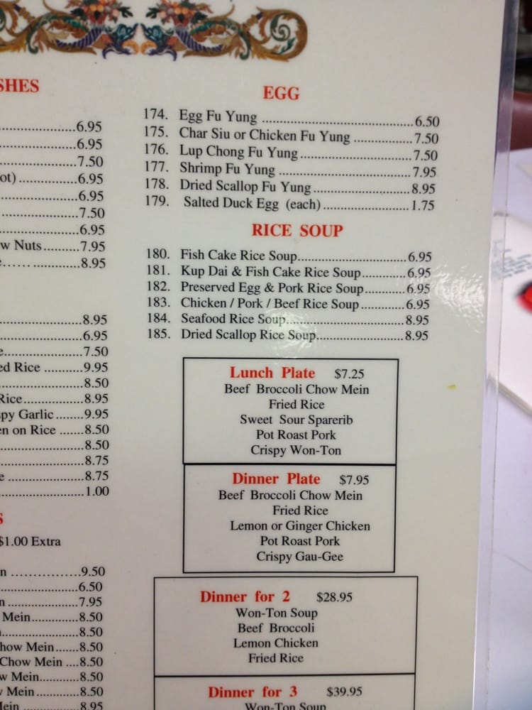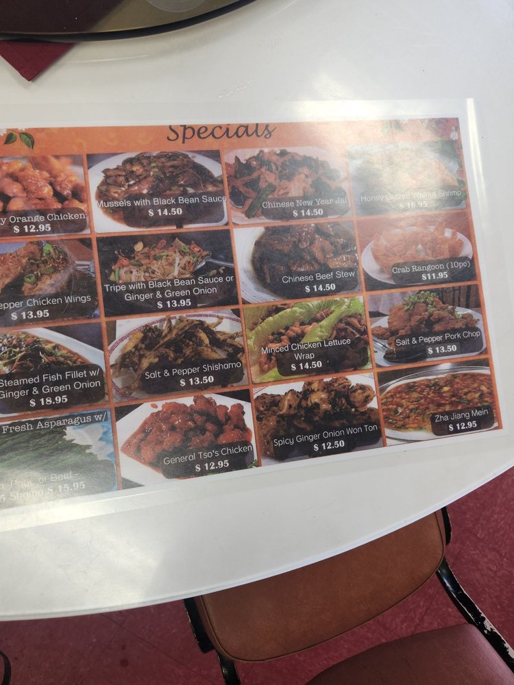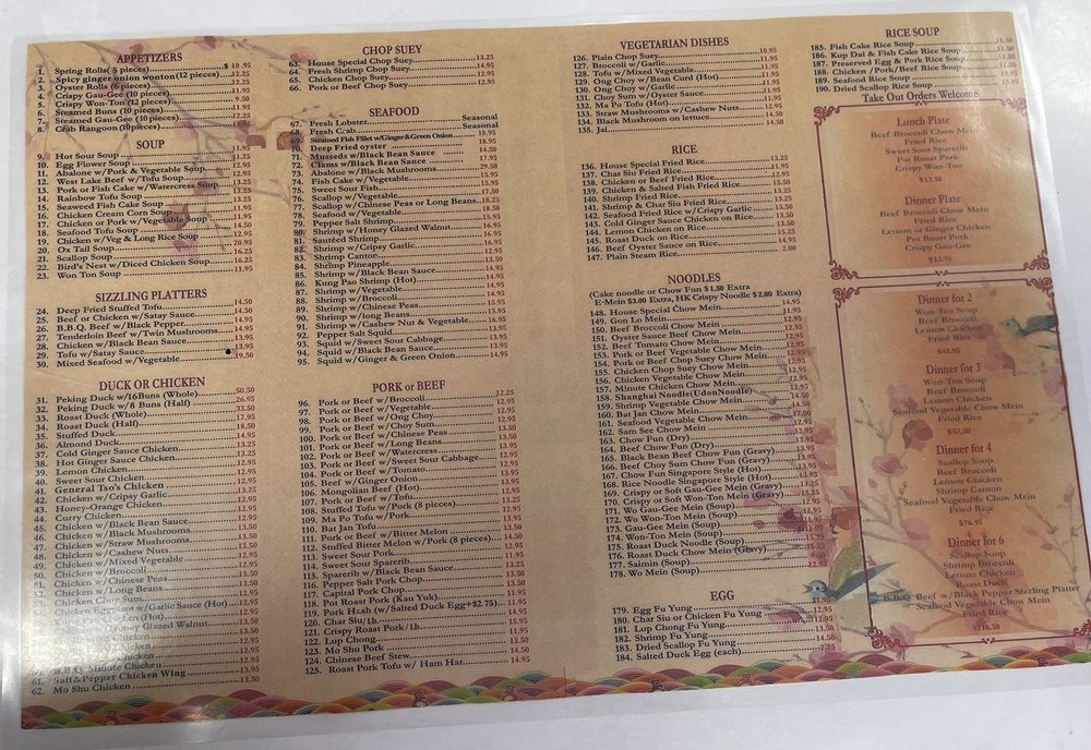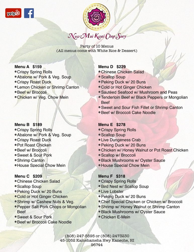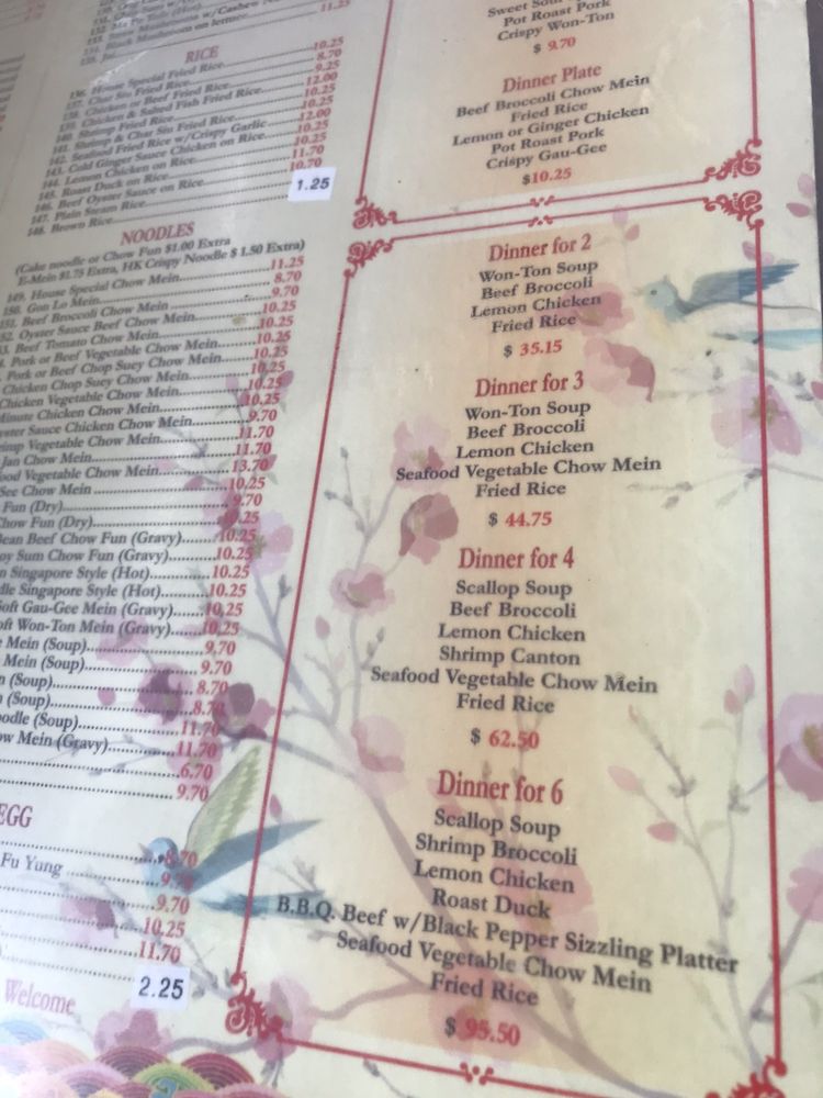 Includes beef broccoli chow mein, fried rice ,lemon or ginger chicken, pot roast pork, and crispy gau gee.